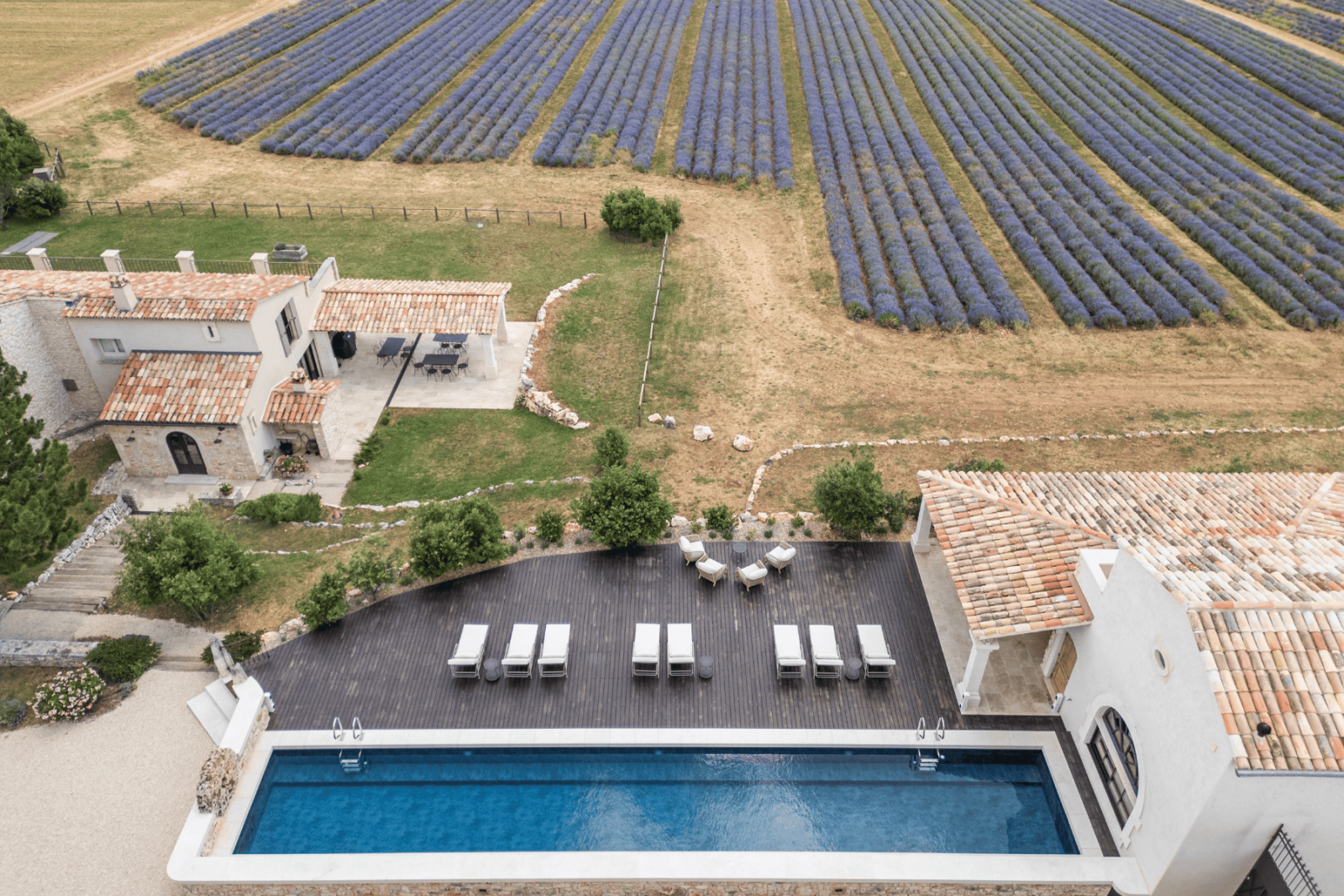 Lit king size avec vue sur les champs de lavande fine depuis l'étage de la Suite Manon au Domaine Château du Bois