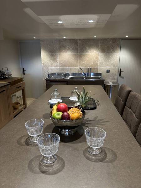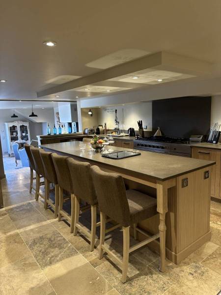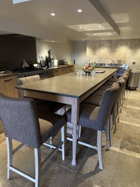 La cuisine attenante de 25 m², équipée d'un îlot central, de fourneaux "Ambassade de Bourgogne" à 5 feux, d'un four de grande capacité, de réfrigérateurs, congélateurs, d'un lave-vaisselle professionnel et d'une arrière-cuisine de 8 m², offre au Chef cuisinier de cet hébergement haut de gamme dans le Luberon toutes les conditions pour cuisiner dans des conditions optimales les plats gastronomiques de la table d'hôtes du Domaine Château du Bois.