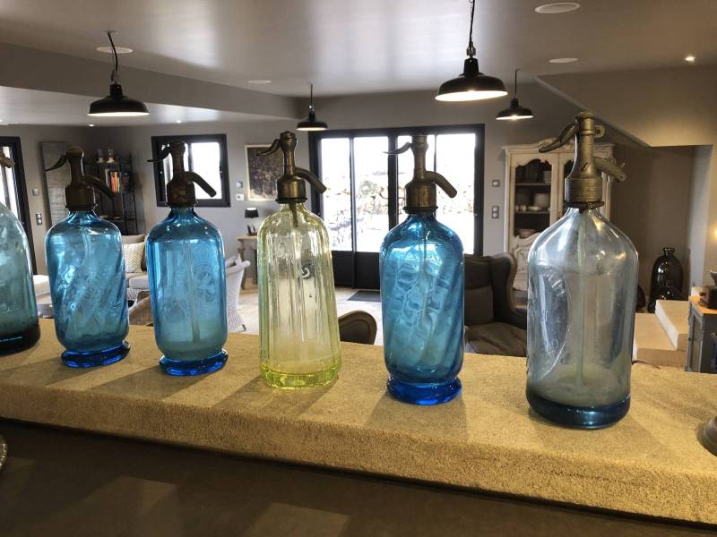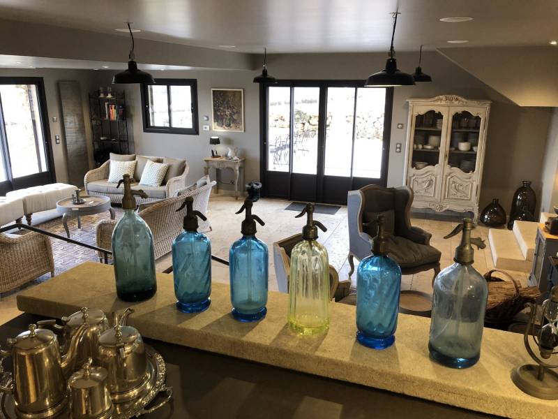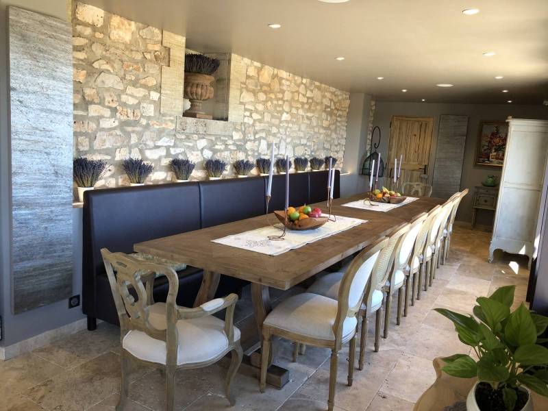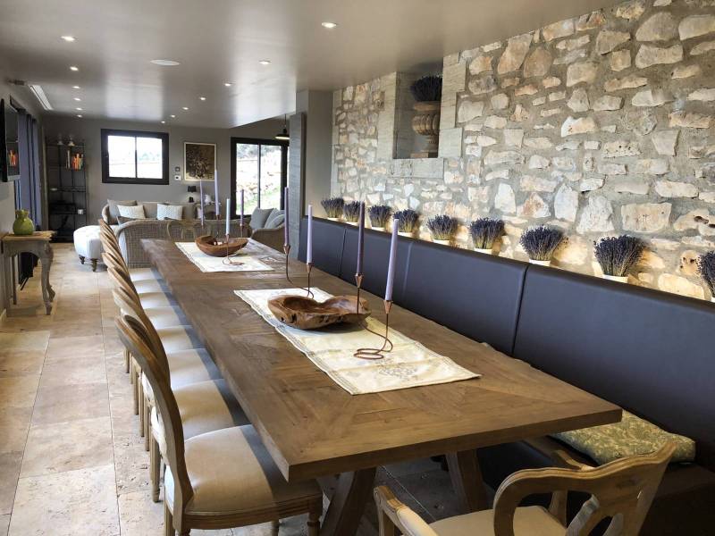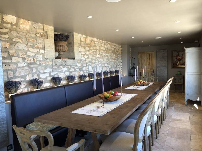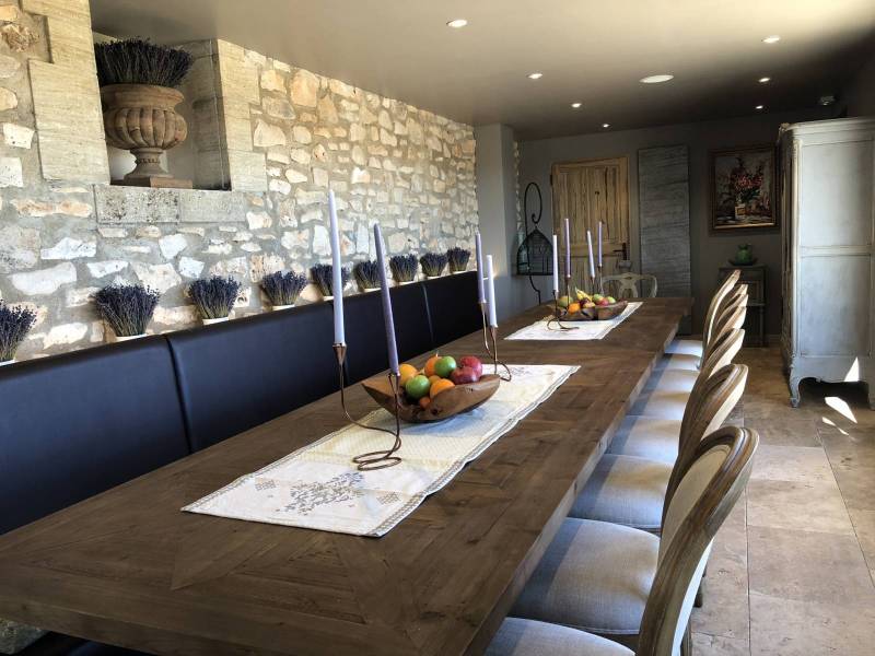La salle à manger de 80 m² installée dans l'ancienne distillerie du Domaine Château du Bois a été aménagée pour accueillir jusqu'à 20 personnes, autour de tables, banquettes et chaises confortables, avec de grandes baies vitrées qui s'ouvrent directement sur les champs de lavande et confèrent à cet espace une luminosité naturelle qui accompagne agréablement les repas.