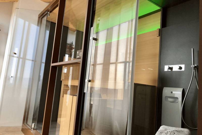 Le sauna et hammam du Domaine Château du Bois se distinguent par leur emplacement privilégié et leur conception intimiste. Installées dans un bâtiment lumineux, les deux cabines séparées offrent un panorama apaisant sur les champs de lavande en contrebas, ainsi que sur le moulin du domaine et les sommets environnants.