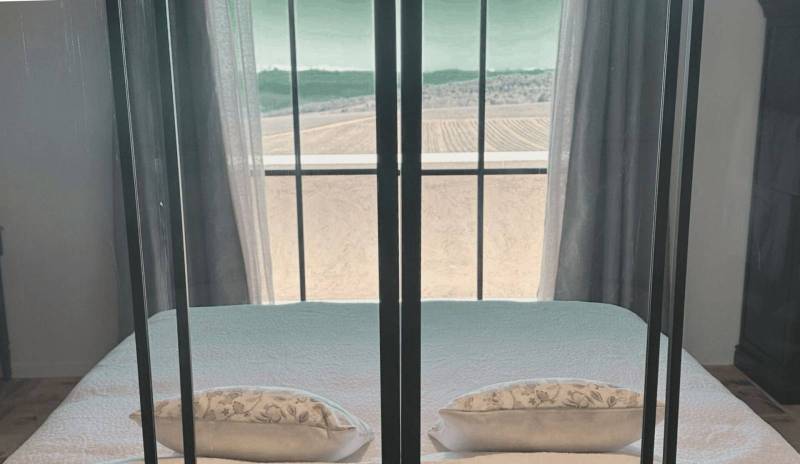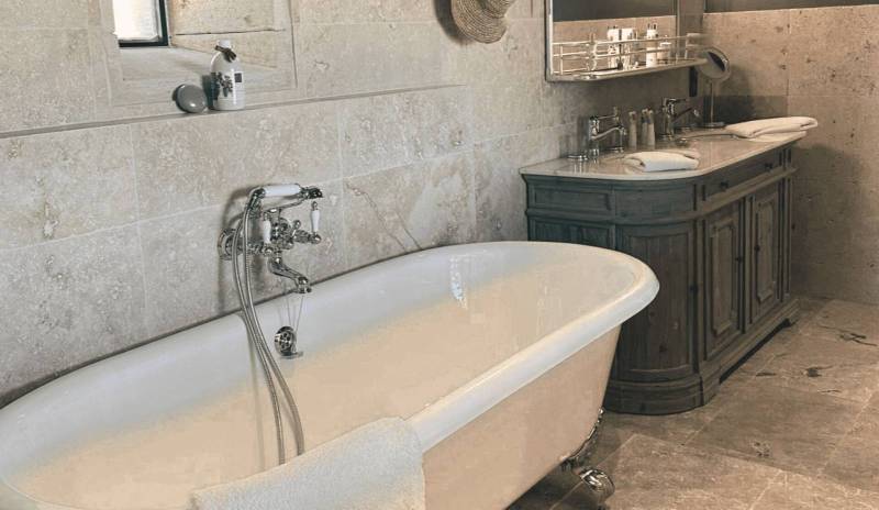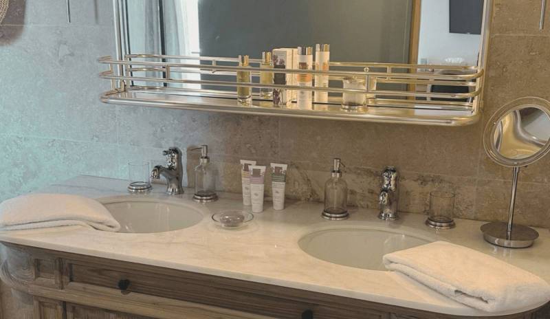 La salle de bain privative, élégante et lumineuse, réunit une baignoire en fonte, une douche italienne de 80x180 cm et un meuble double vasques pour un confort absolu, tandis que le balcon privé de 10 m² aménagé avec deux fauteuils ouvre sur un panorama exceptionnel embrassant les champs de lavande, les montagnes des Pré-Alpes et le moulin emblématique du domaine, faisant de cet espace extérieur l'un des atouts les plus remarquables de cette suite haut de gamme dans le Luberon.