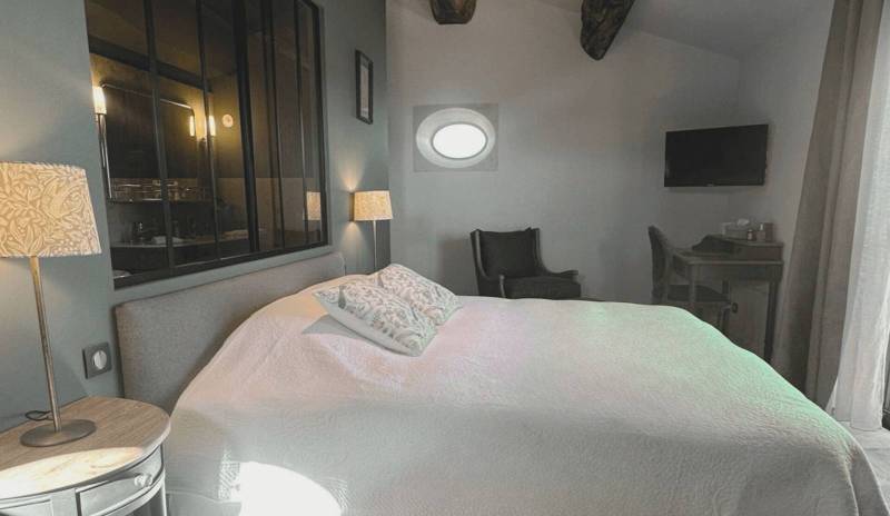 Installée à l'étage de la maison de bien-être, la suite Bénézet du Domaine Château du Bois développe 30 m² organisés autour d'un lit 180x190 avec double sommier, d'un bureau, d'un coin TV et d'une armoire et commode en bois qui apportent une touche authentique caractéristique de cette demeure d'exception en Provence.